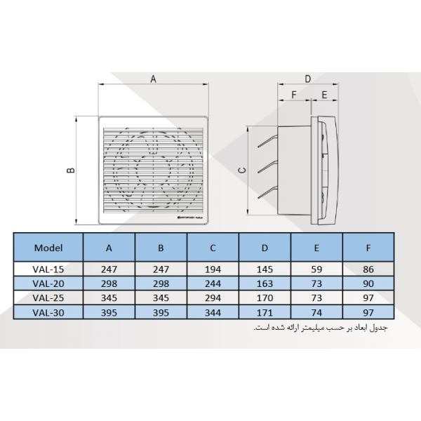 این هواکش با دبیm3/h (300 - 820) دارای ناحیه تخلیه مربع شکلی به طولmm (150 - 300) و برای نصب روی پنجره و یا تخلیه آزاد استفاده می شود. نصب موتور به بدنه پلاستیکی باعث شده تا صدای محصول کاهش یابد. این محصول با استفاده از پلاستیک تزریق شده ساخته شده، به اتصال ارت مجهز بوده و ولتاژ کاری آن 220V-50Hz است. همچنین موتور مورد استفاده در این محصول کلاس B است و این هواکش مجهز به دمپر اتوماتیکی است که با جریان هوا پس از روشن شدن فن باز می شود. این محصول برای کار در محیط هایی با دمای تا 40 درجه سانتی گراد مناسب است. هواکش های VAL برای تهویه اتاق ها و آشپزخانه های متوسط و بزرگ طراحی شده اند.